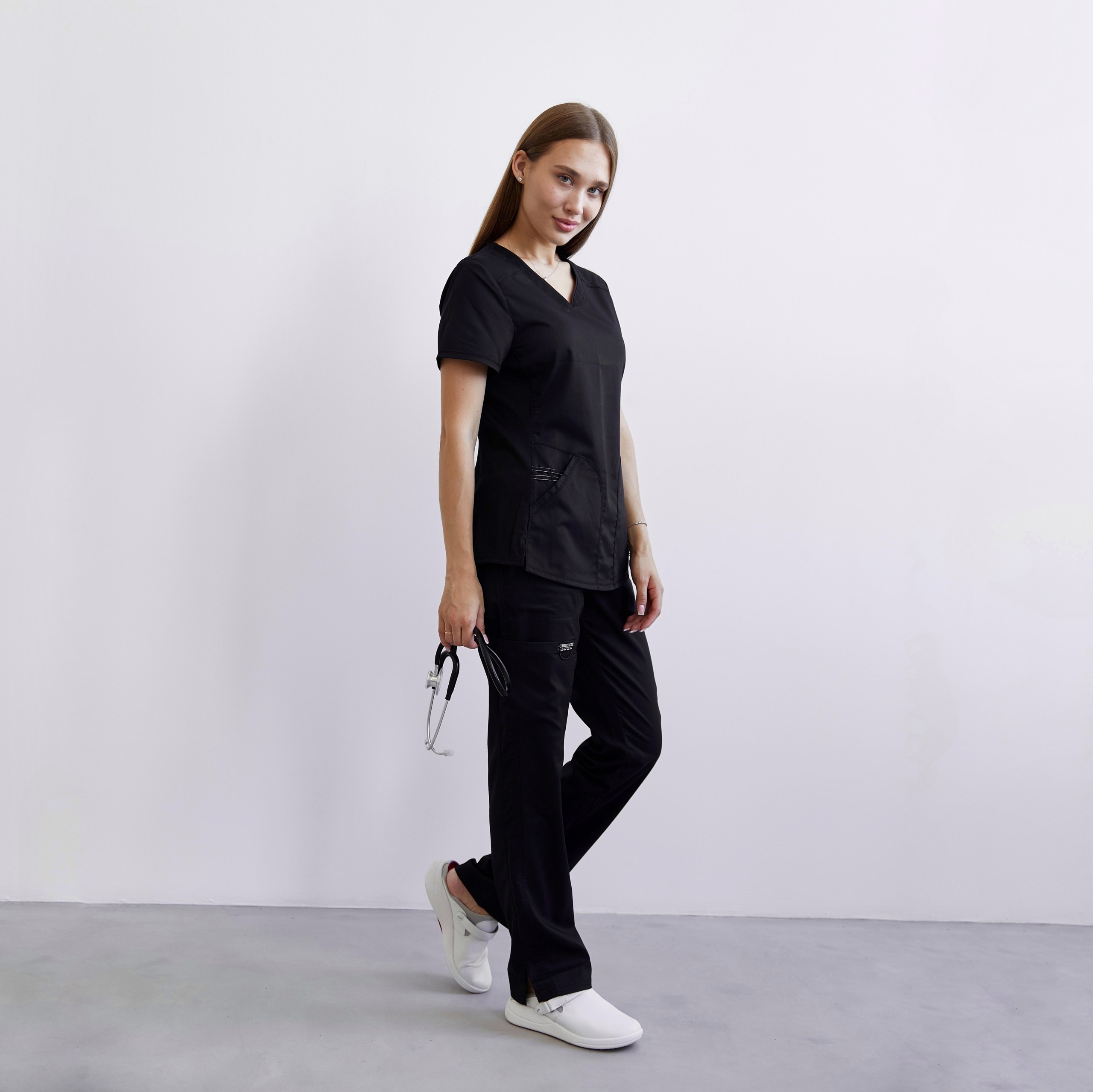 Женственные медицинские брюки со средней посадкой и зауженными штанинами подойдут на любой тип фигуры.