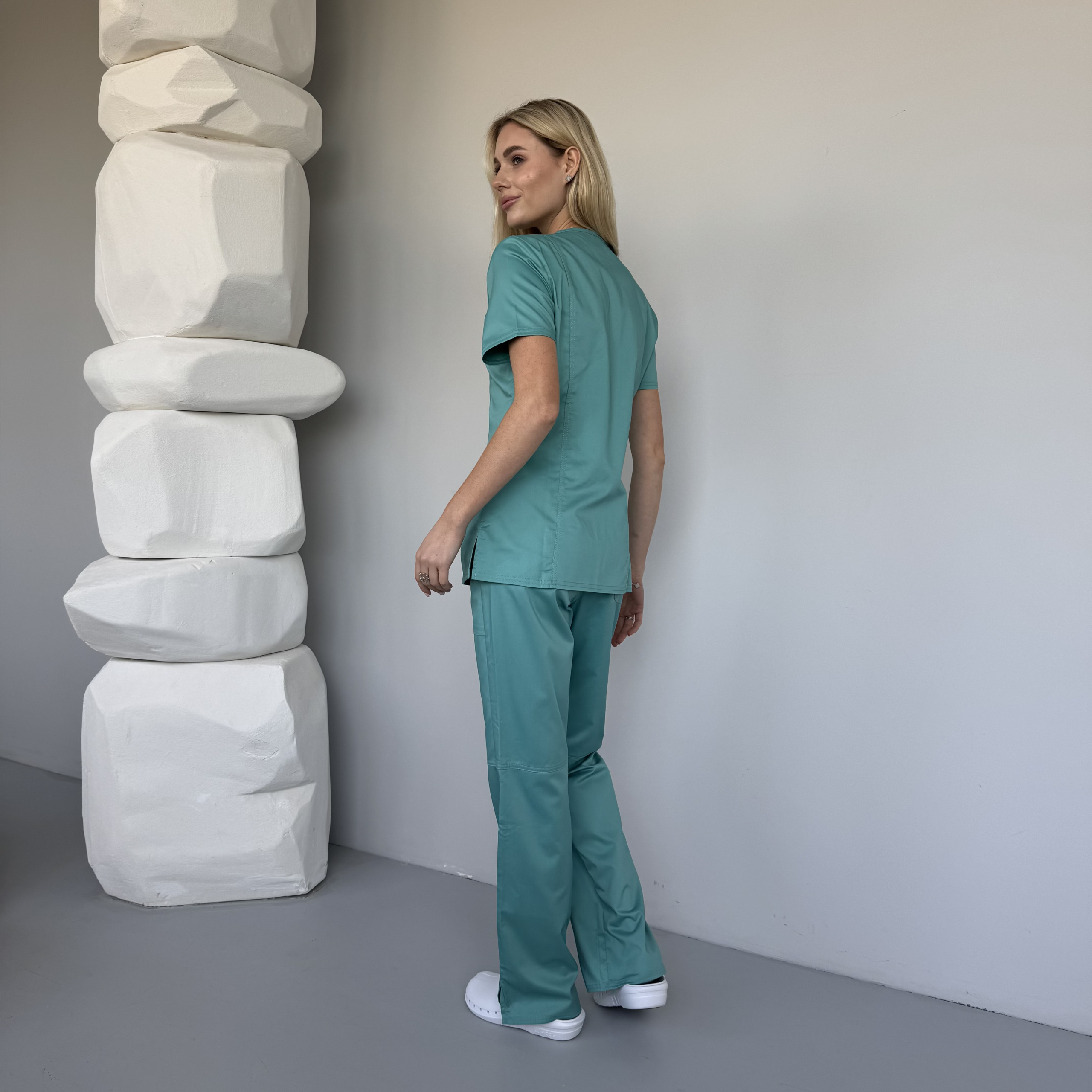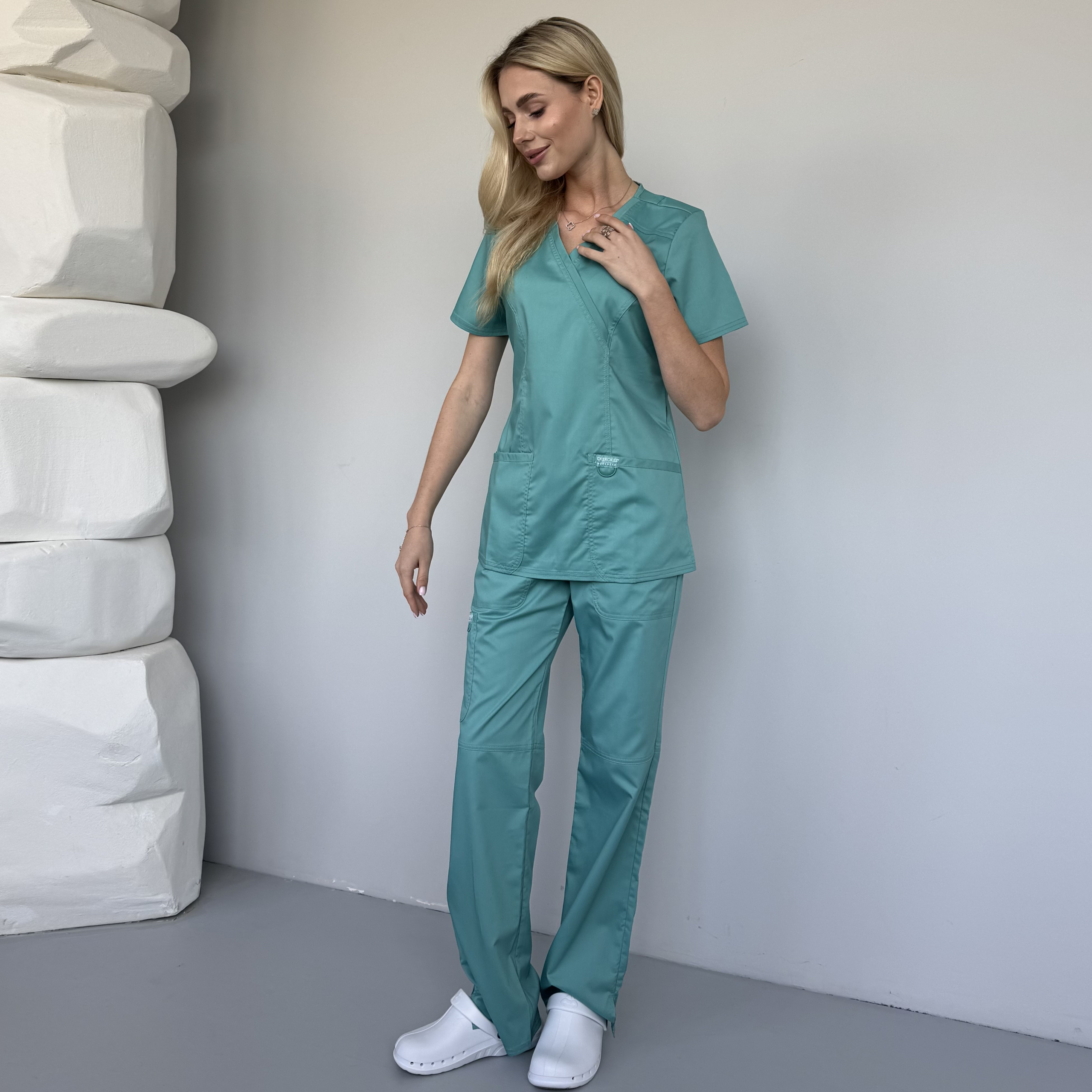 Женский медицинский костюм WW Revolution сочетает современный крой и комфорт. В комплект входят женский медицинский топ с запахом и женские медицинские брюки прямого кроя со средней посадкой. Практичные карманы, эластичный пояс и удобные детали делают костюм универсальным выбором для повседневной работы в клинике.