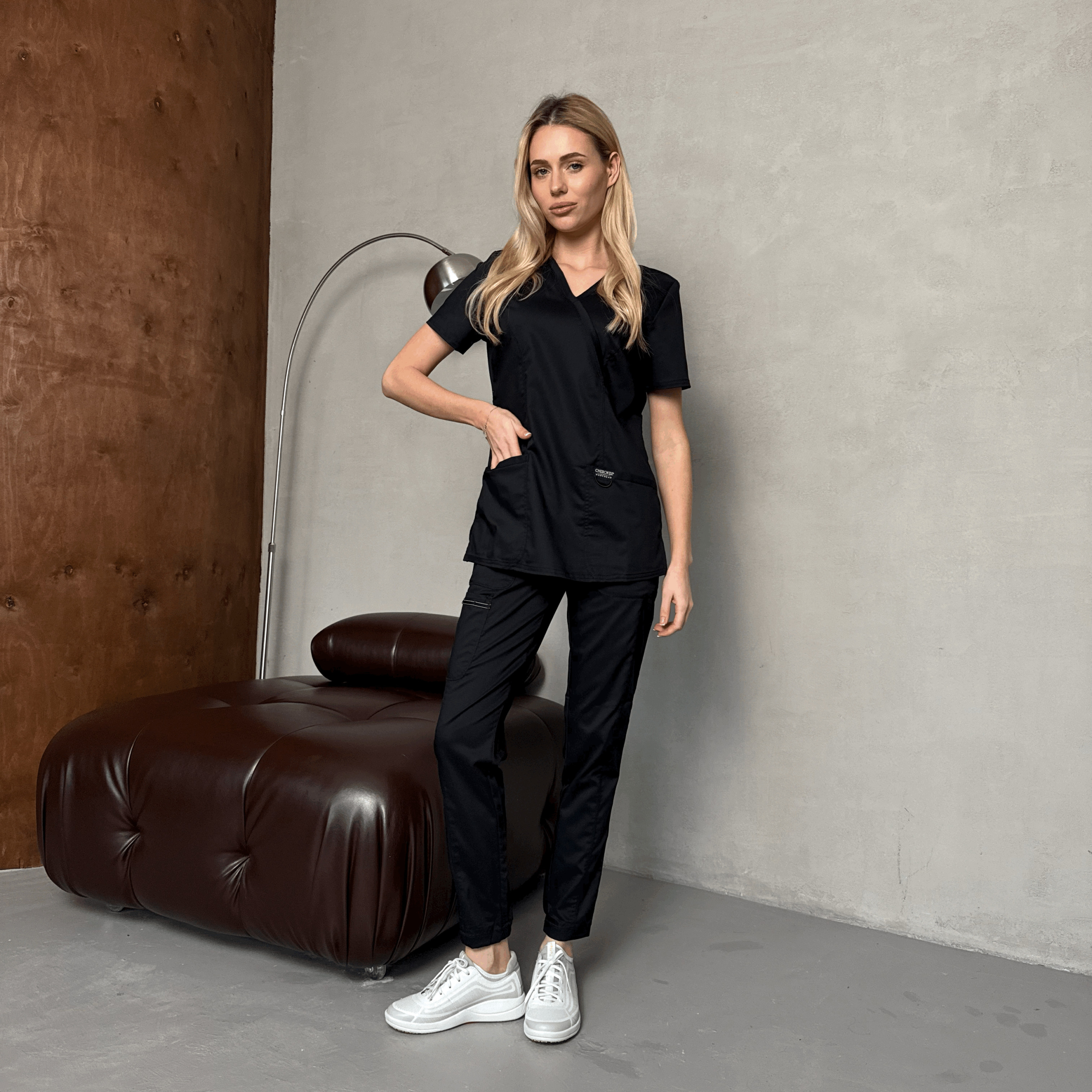 Женские медицинские брюки, имеют дышащую сетку на эластичном поясе, два передних накладных кармана, карман для мобильного телефона, два задних накладных кармана и эластичные петли для инструментов. Низ брюк сзади оснащен резинкой, что делает эту модель зауженной.
