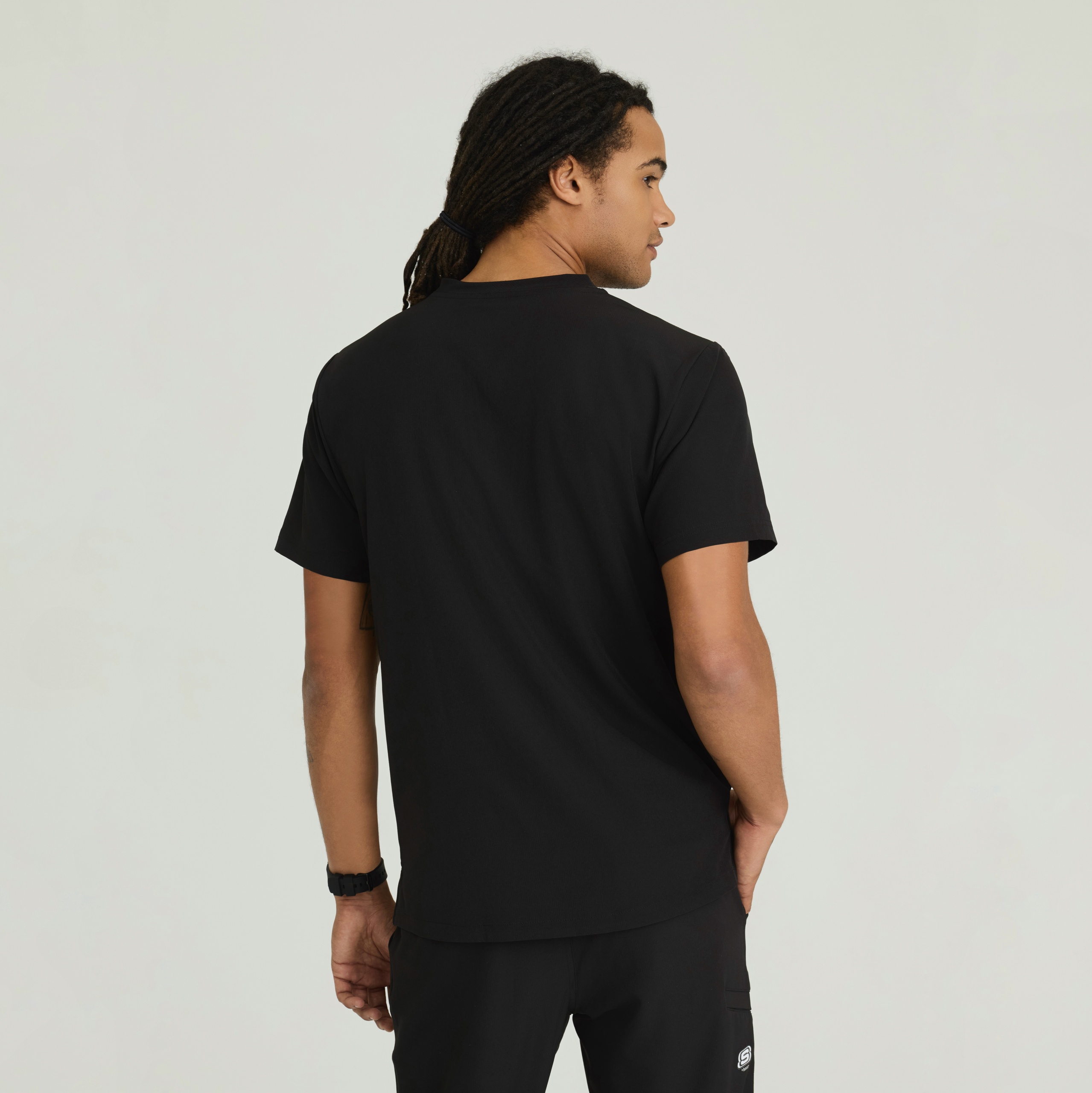 Мужской медицинский костюм от американского бренда Skechers черного цвета. В комплект входят джоггеры и топ.