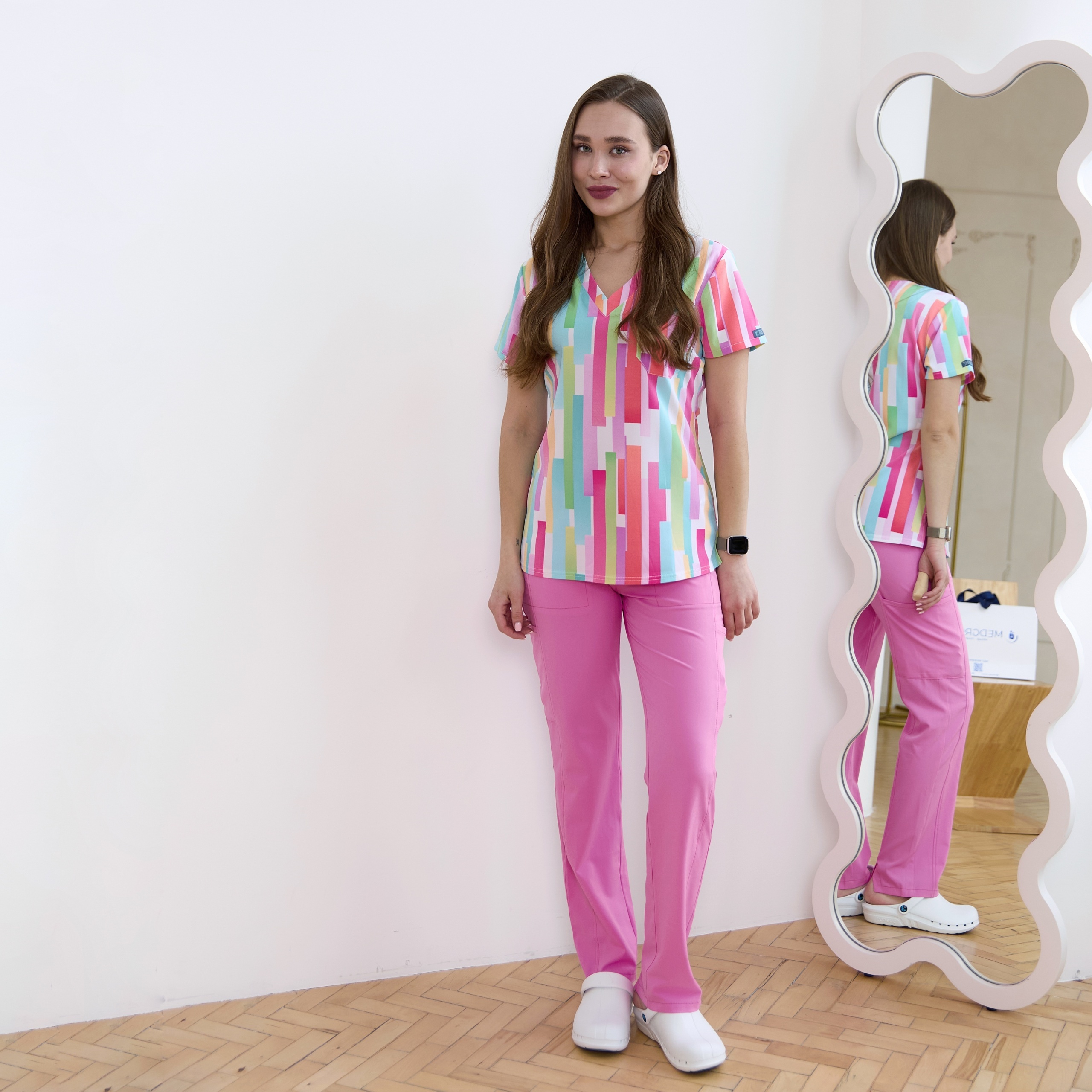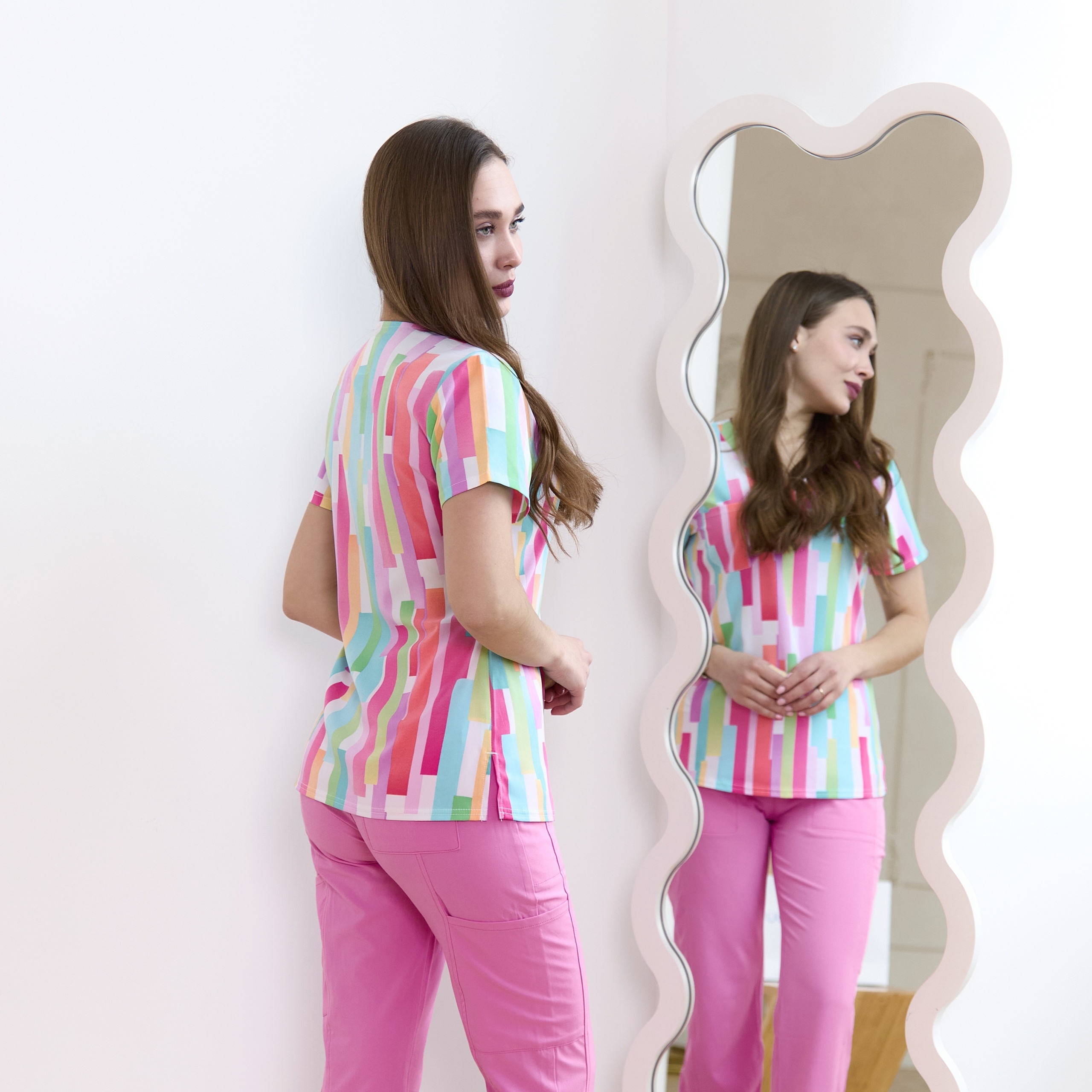 Стильный и легкий медицинский топ создан для тех, кто ценит комфорт и свежий внешний вид. Дизайн с абстрактным принтом в нежных оттенках розового, голубого, желтого и зеленого делает его универсальным и легко сочетаемым с брюками любого цвета.