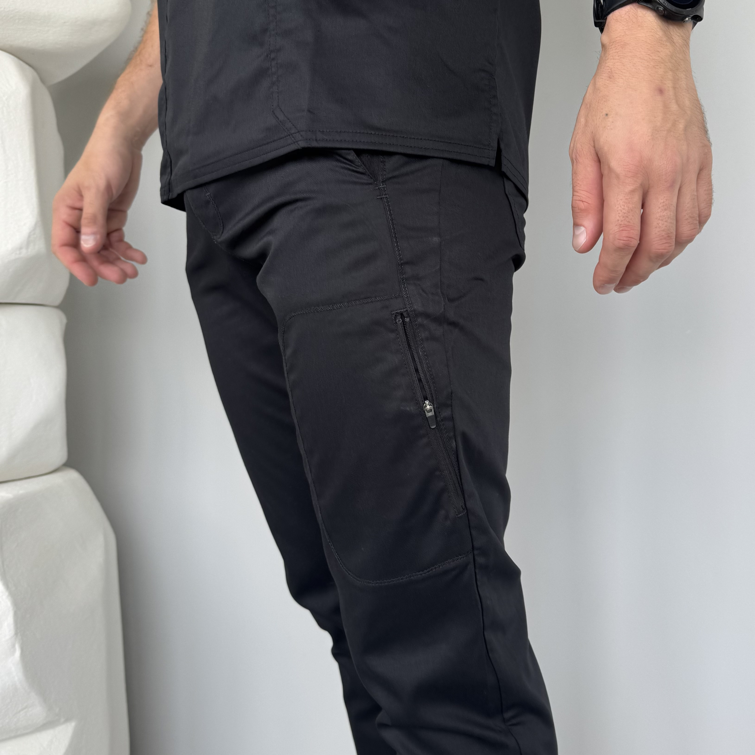 Доповнюють образ медичні чоловічі джогери середньої посадки, оснащені еластичним поясом та шнурком для ідеального регулювання об’єму. Штани мають дві косі кишені з дихаючою сітчастою підкладкою, задні кишені та бічна накладна кишеня на блискавці для максимальної функціональності.
