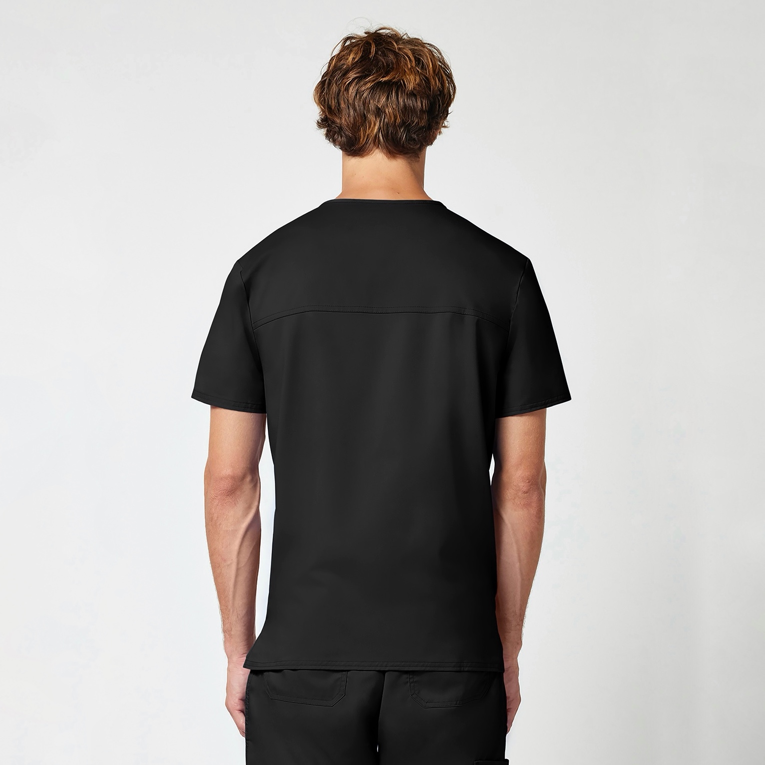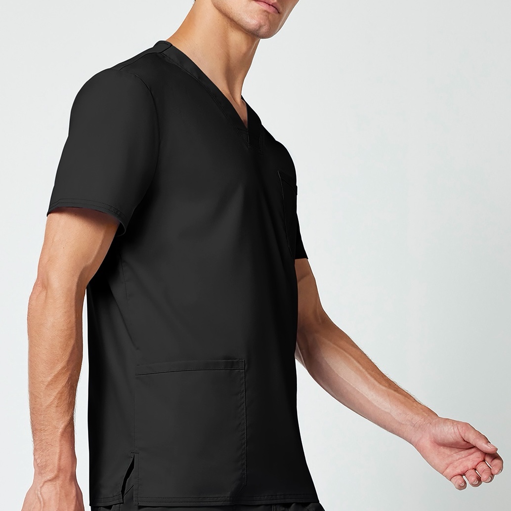 Чоловічий хірургічний топ з V-подібним вирізом, прямого силуету. Декоративне оздоблення подвійною строчкою в тон основної тканини, логотип на лівій кишені. Дві накладних кишені спереду, одна кишеня на грудях. З лівого боку D-образне кільце для пропуску або бейджа.