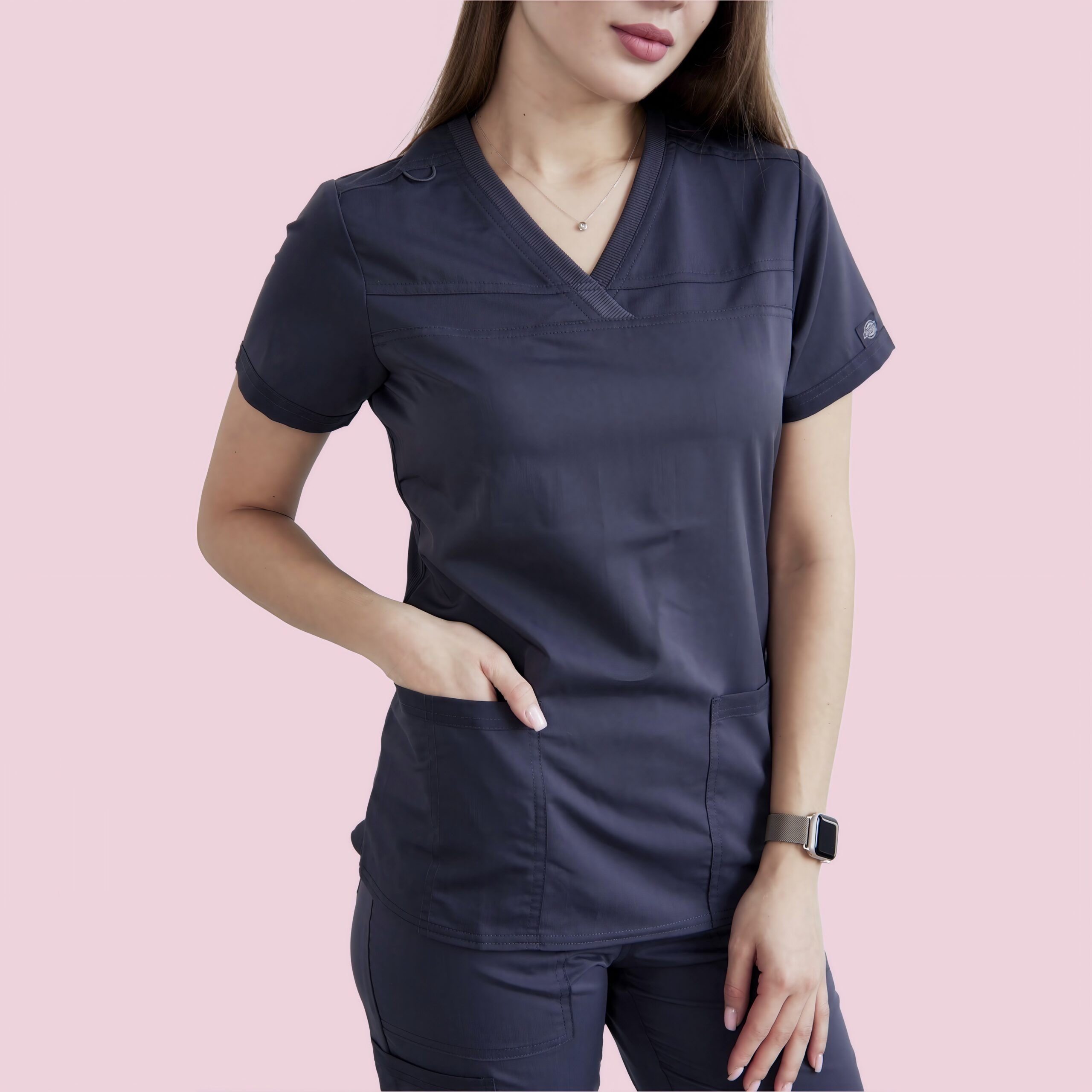 Стильний медичний топ із V-подібним вирізом створений для максимального комфорту та функціональності. Його ключові особливості: трикотажна обробка вирізу, два містких накладних кишені та еластичні панелі на спинці для свободи рухів. Закруглений нижній край додає сучасного вигляду. На правому плечовому шві розташована еластична петля для бейджа. Лівий рукав прикрашений фірмовою тканинною нашивкою Dickies.