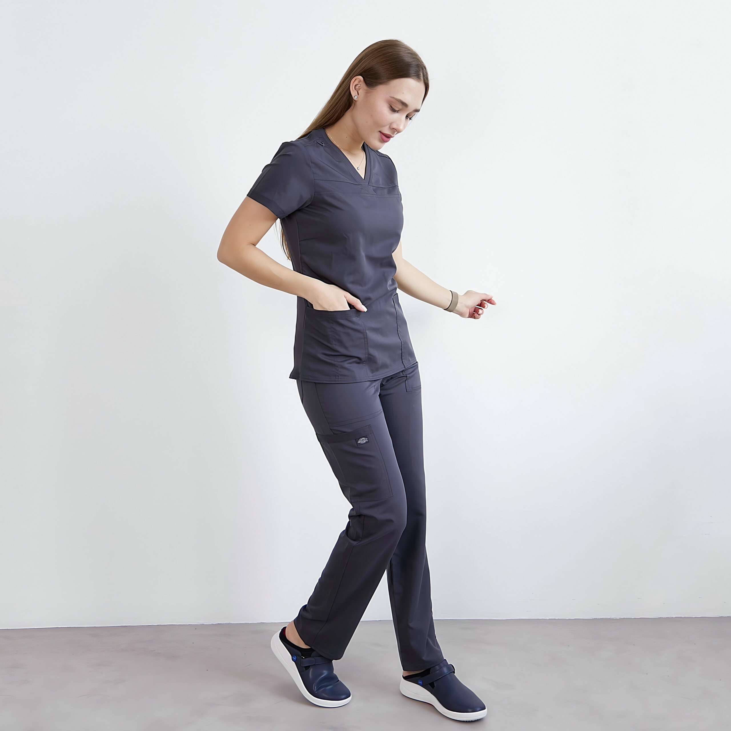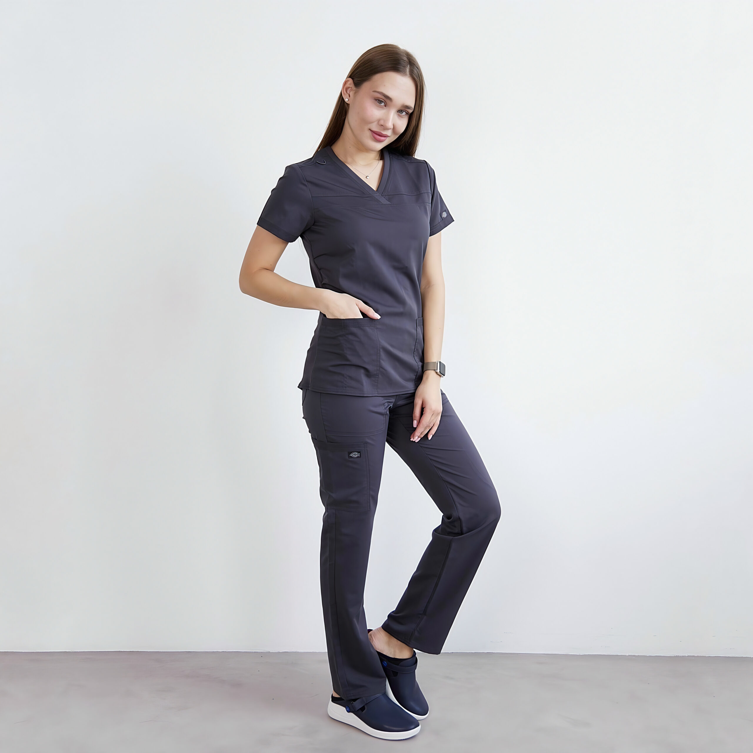 Комфортні медичні штани середньої посадки з еластичним поясом, доповненим внутрішнім шнурком для надійної підтримки. Звужені штанини роблять модель універсальною та стильною, а велика кількість кишень забезпечує функціональність: дві передні кишені, одна кишеня для інструментів, одна прихована кишеня на блискавці та дві задні кишені. На правій стороні декоративна утилітарна петля.