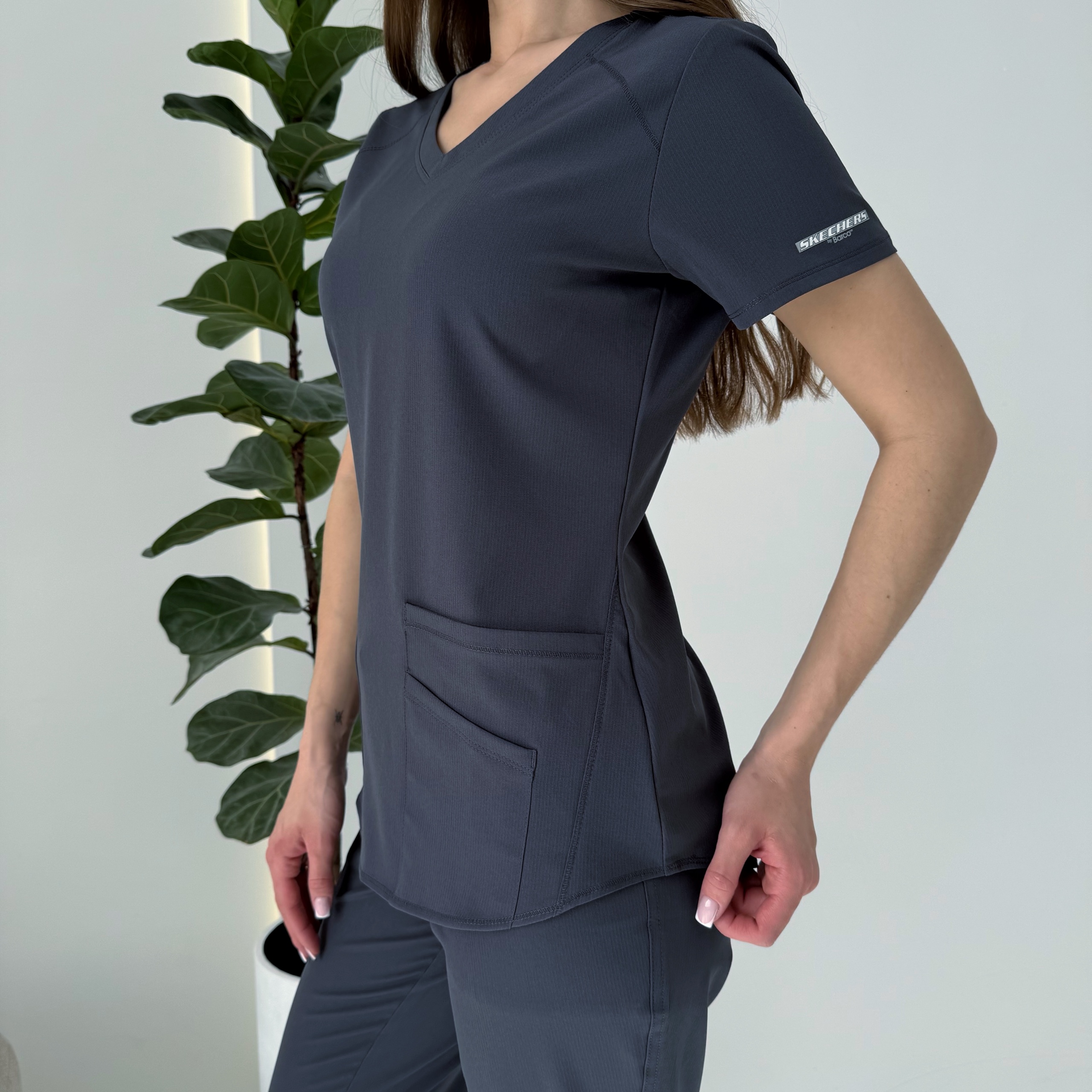 Зустрічайте свій новий улюблений медичний топ. Цей універсальний топ Skechers by Barco має розкльошений низ, який доповнює ефектний виріз. Петля на лівому плечі забезпечує зручне місце для кріплення піктограми або інших предметів, які необхідно тримати під рукою. Вологовідвідна тканина, виготовлена з перероблених пластикових пляшок, забезпечить комфорт протягом усієї зміни.