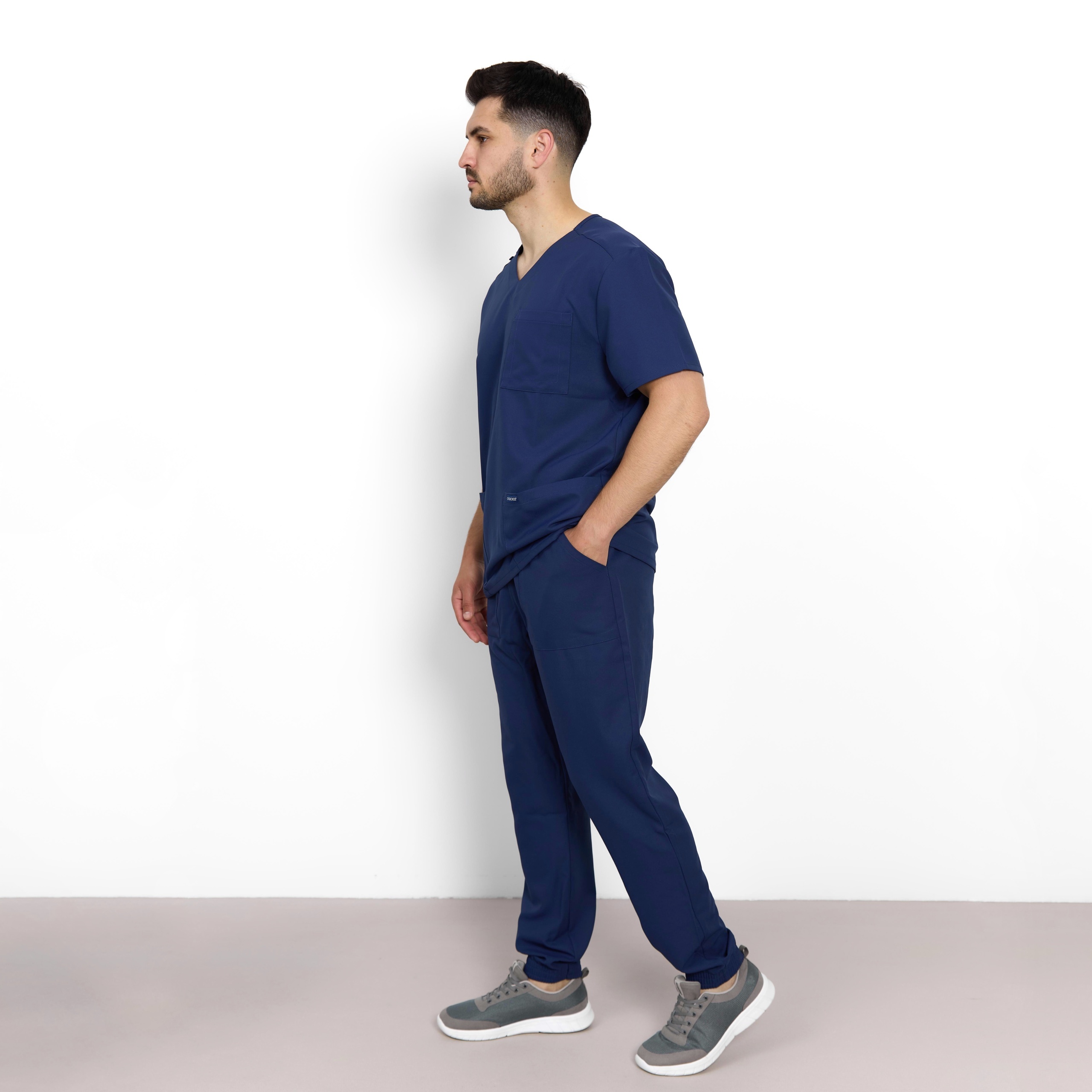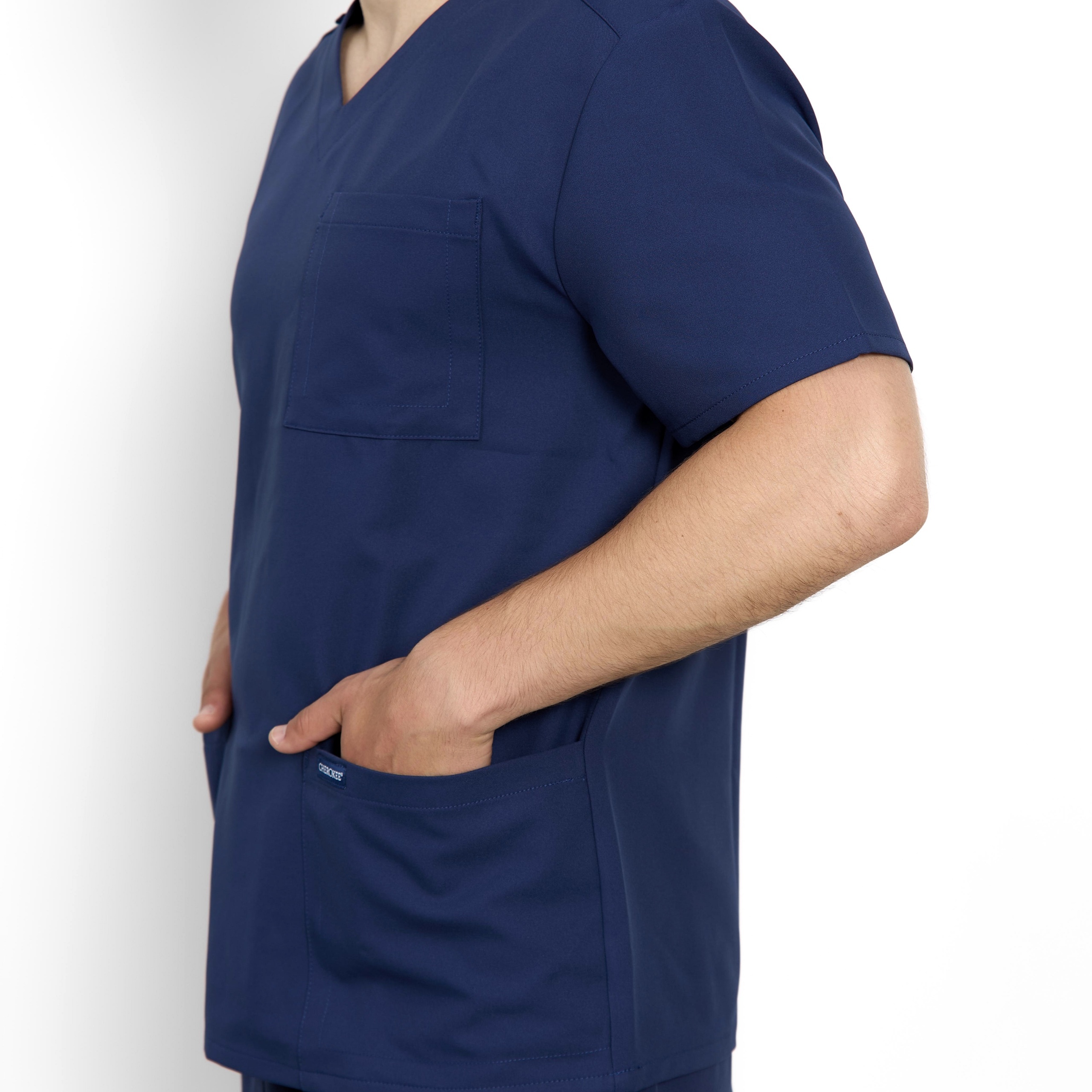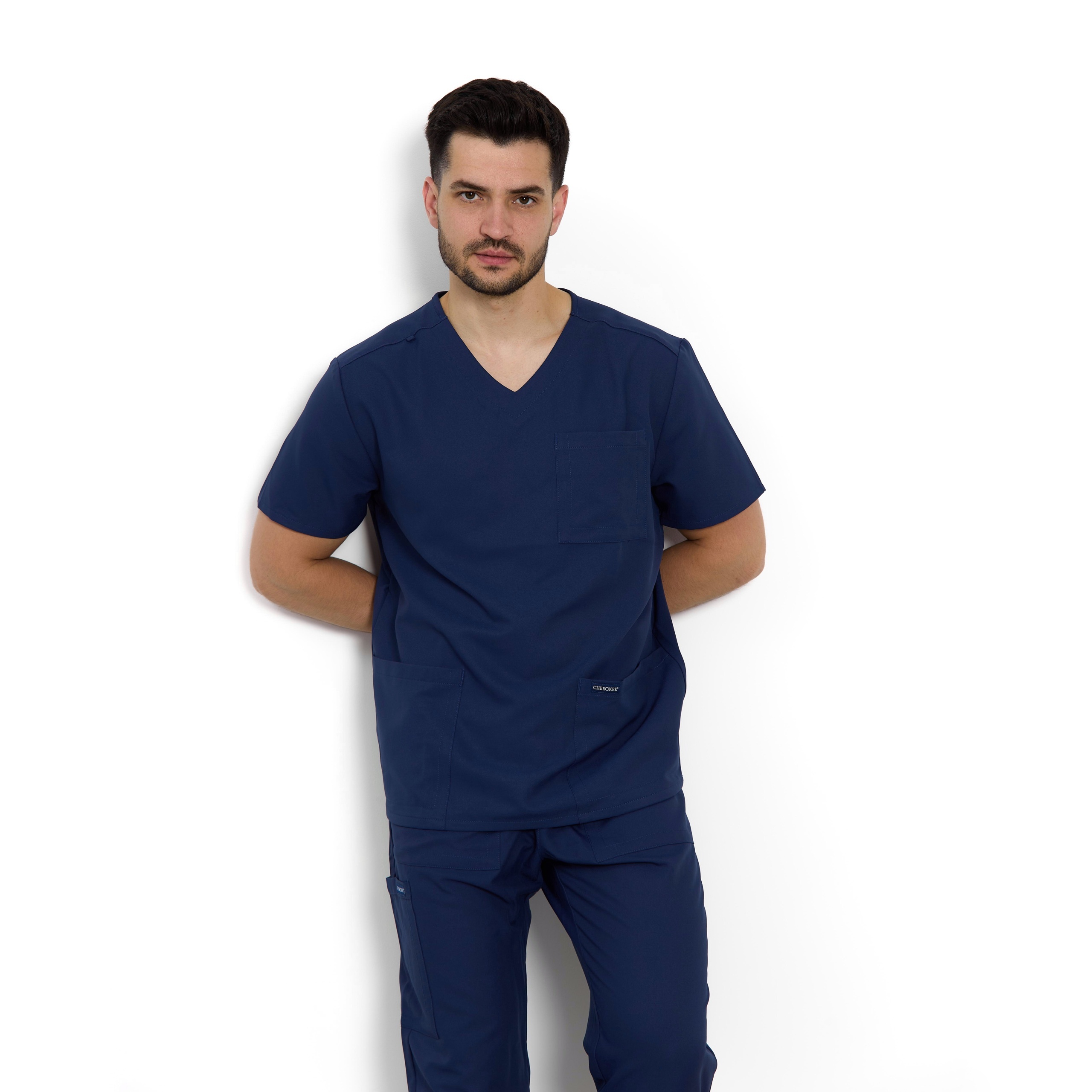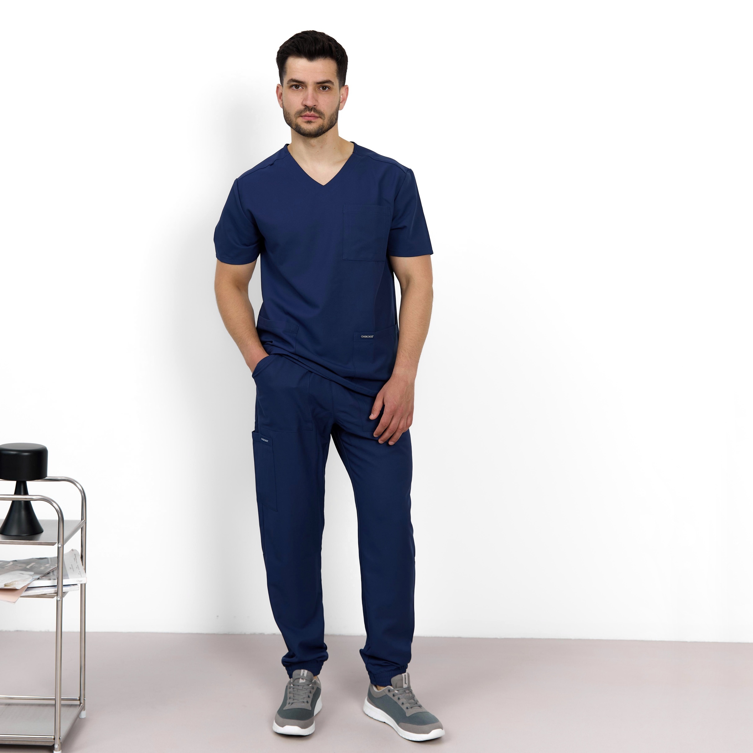 Ці чоловічі медичні джогери від бренду Cherokee виконані у сучасному стилі. Еластичний пояс середньої посадки із застібкою-блискавкою має внутрішній шнурок для регулювання. Всього чотири кишені: дві передні кишені з похилим входом, одна кишеня-карго з прорізом для ручки/інструменту на правій стороні власника та одна задня накладна кишеня. Кишеня-карго та задня кишеня мають зворотну обробку для додаткової деталізації. Медичні чоловічі джогери з гумкою доповнені з еластичними манжетами та декоративним тоновим рядком.