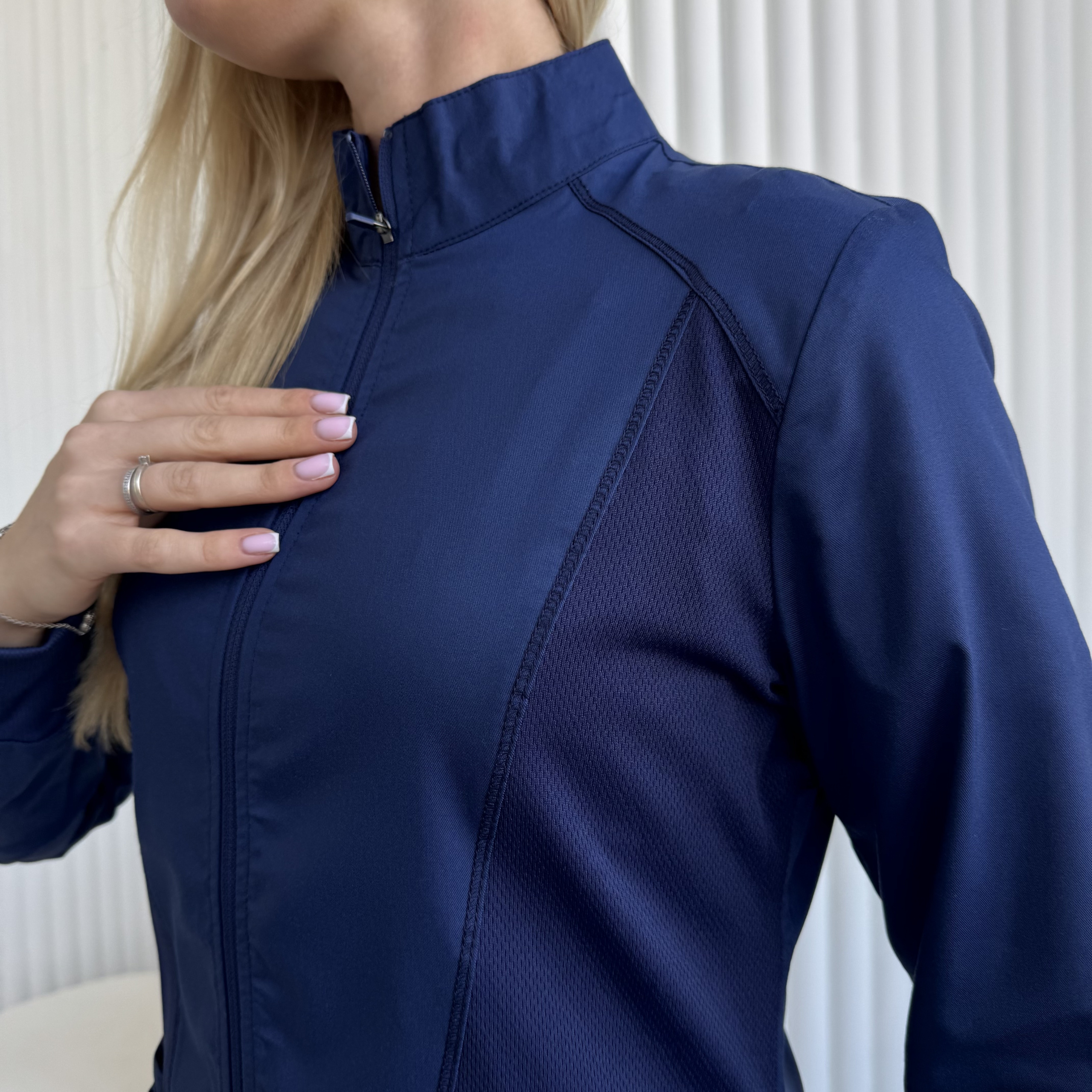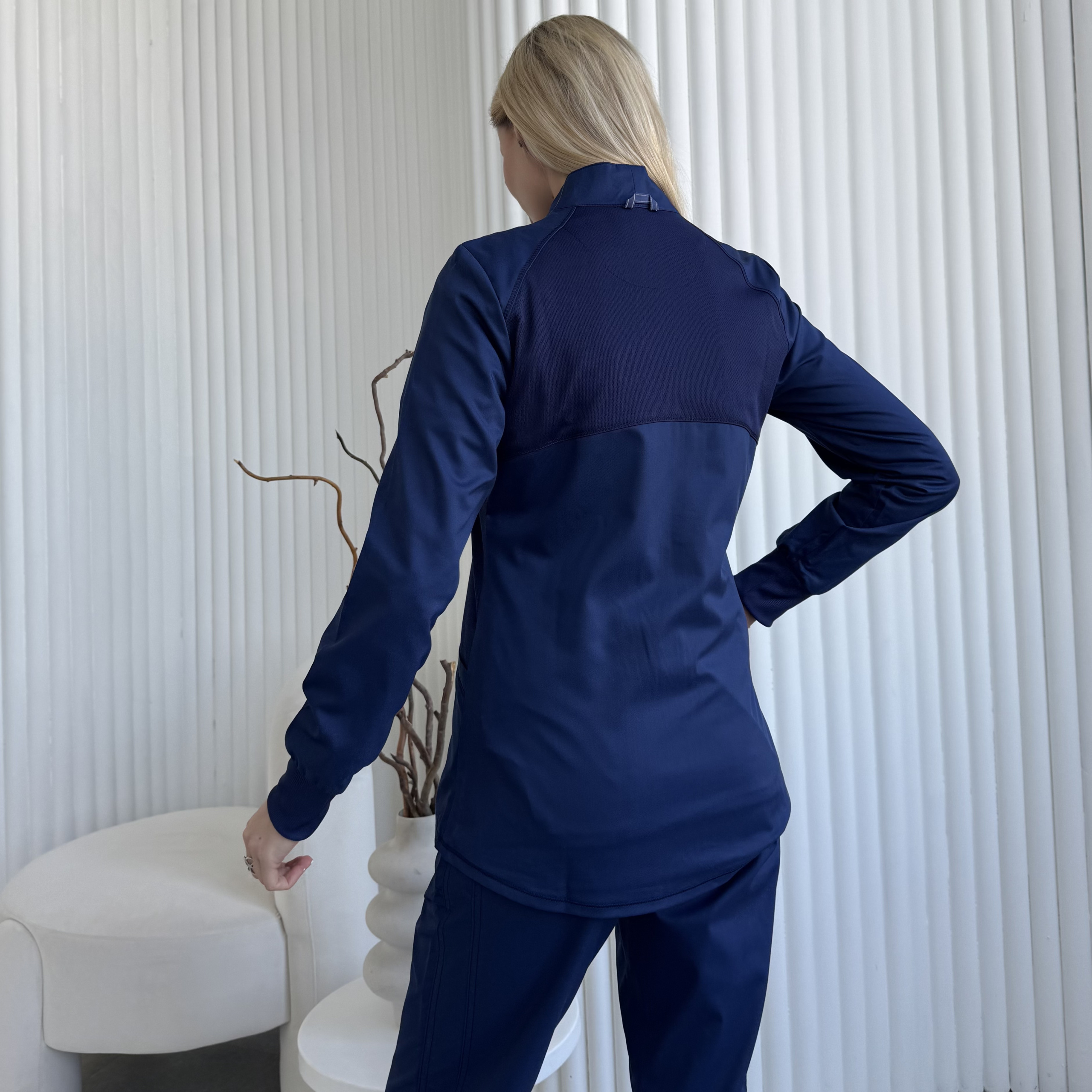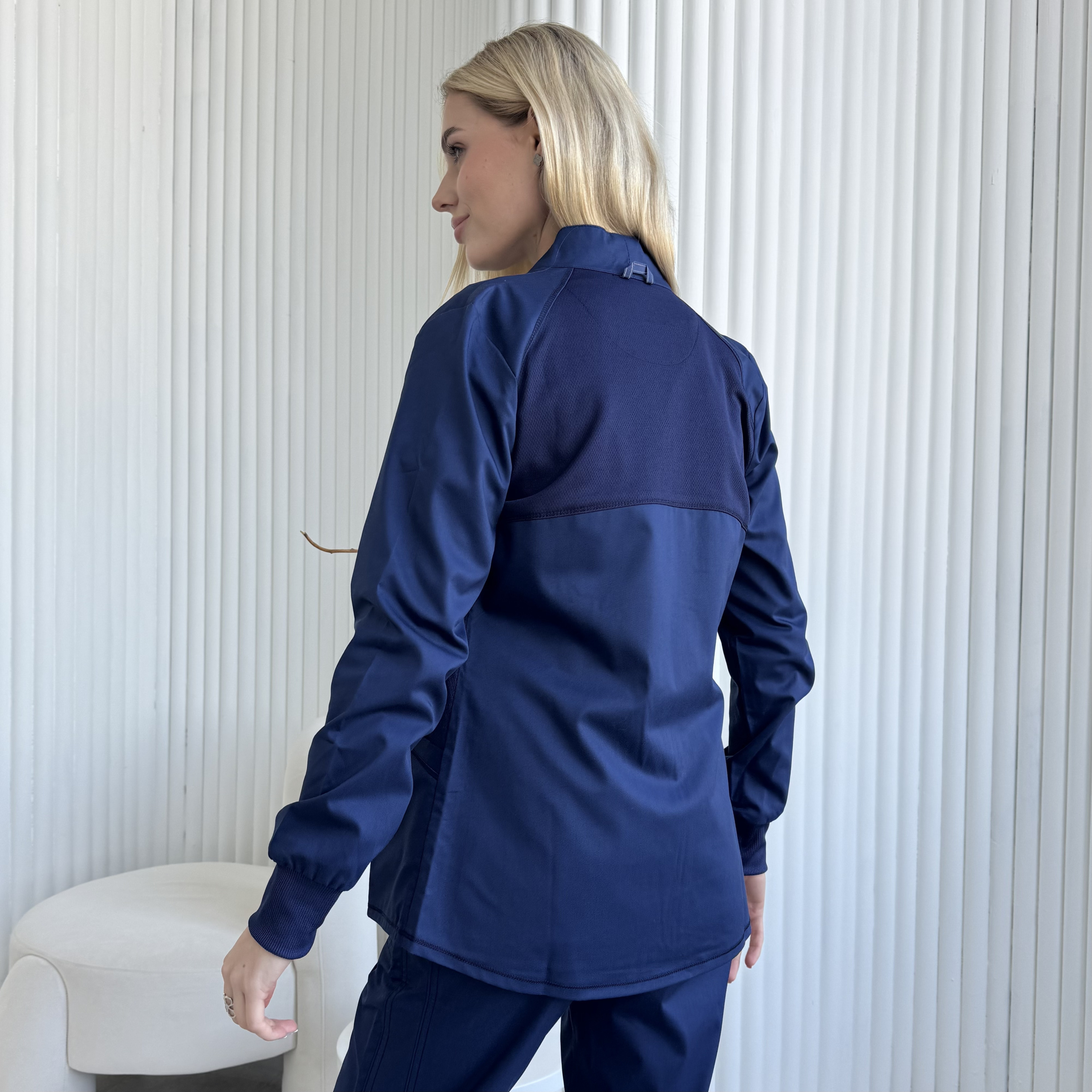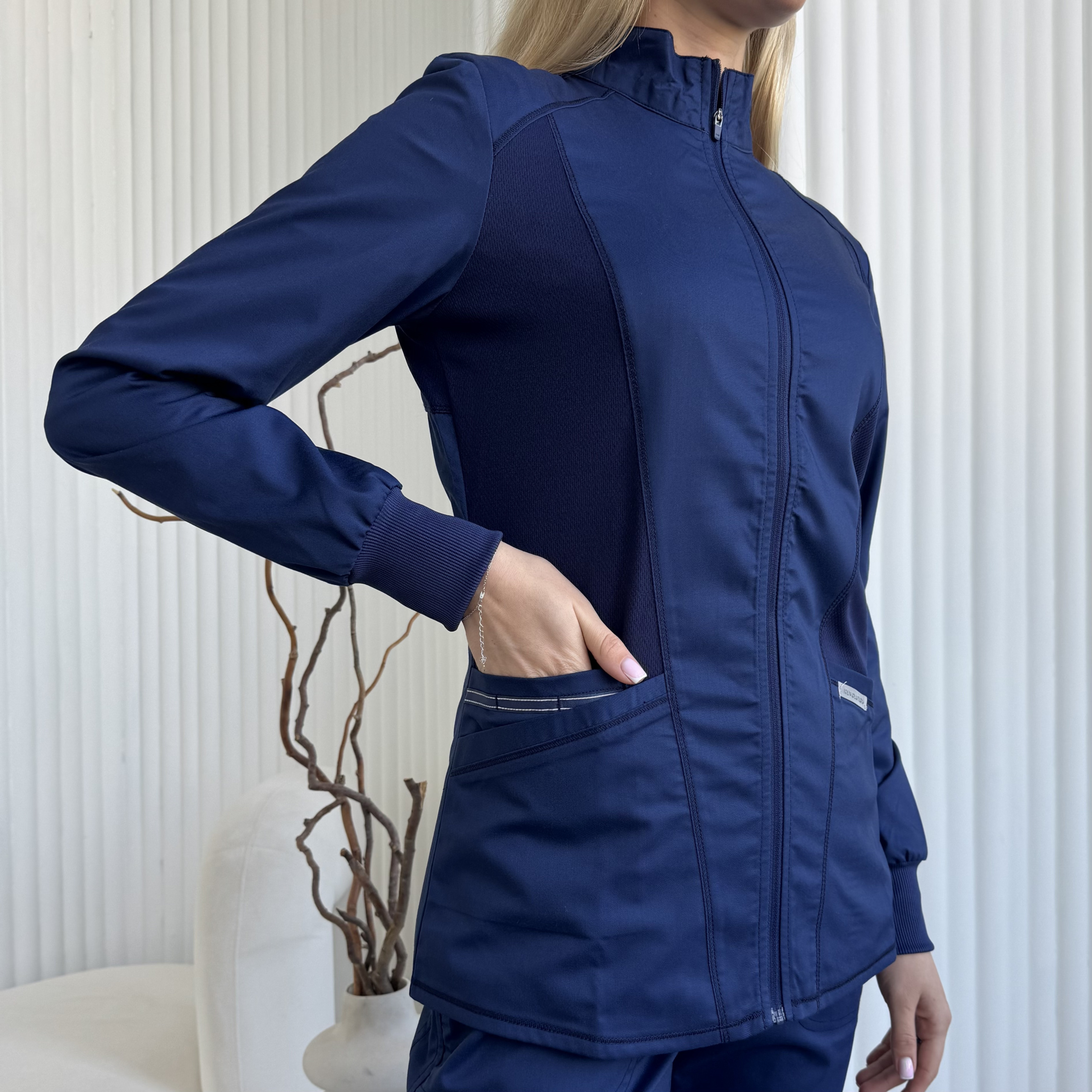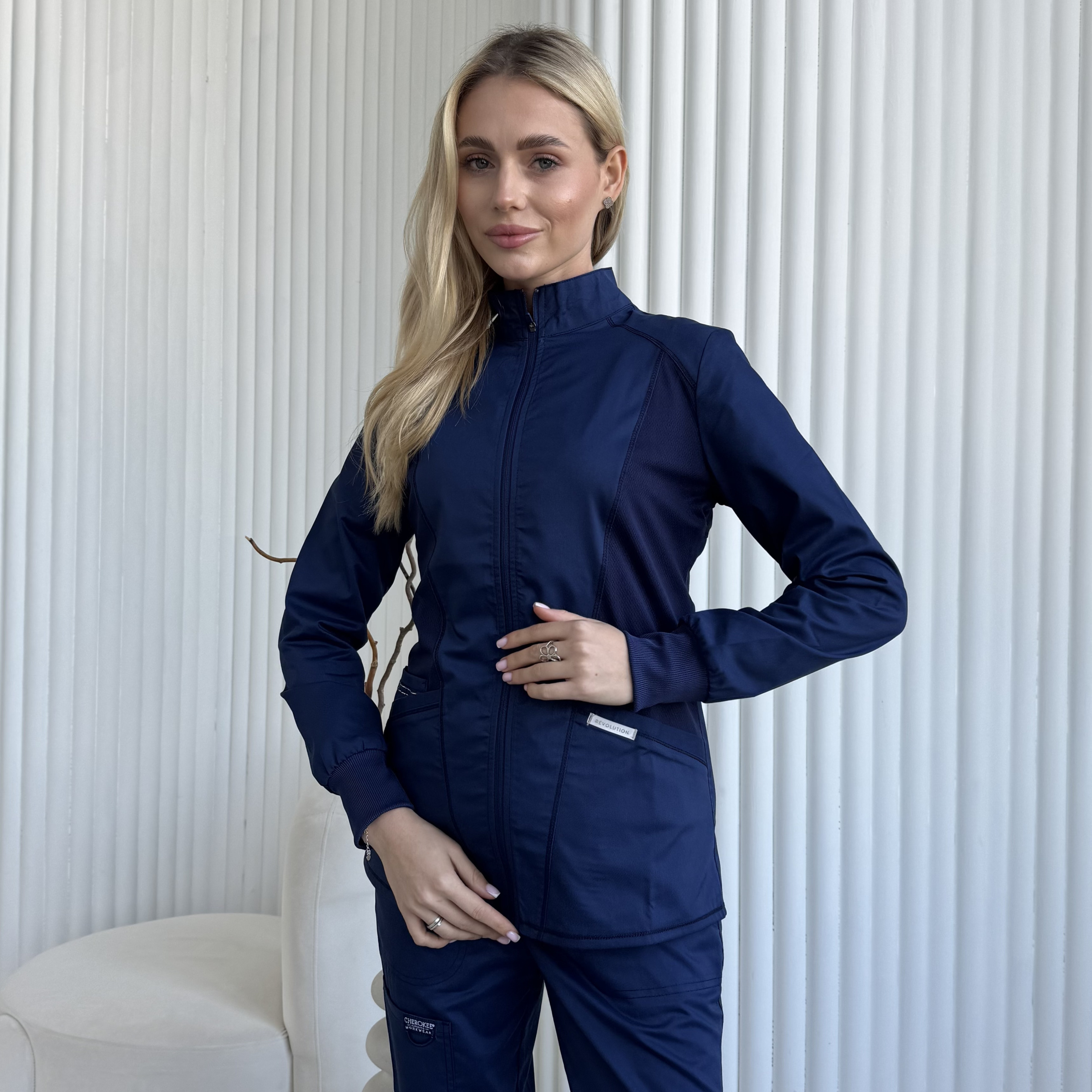 Жіноча медична кофта на блискавці з асиметричним подолом та дихаючими вставками. Сучасний класичний крій забезпечує зручність і свободу рухів. Модель поєднує стиль і практичність: м’які манжети, функціональні кишені та подовжена спинка роблять кофту комфортною для роботи у медичній сфері.