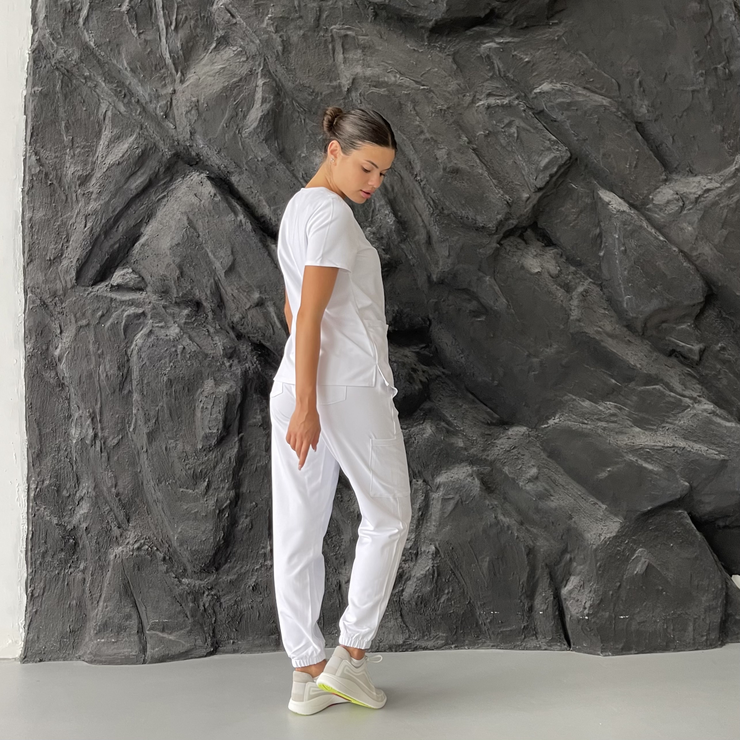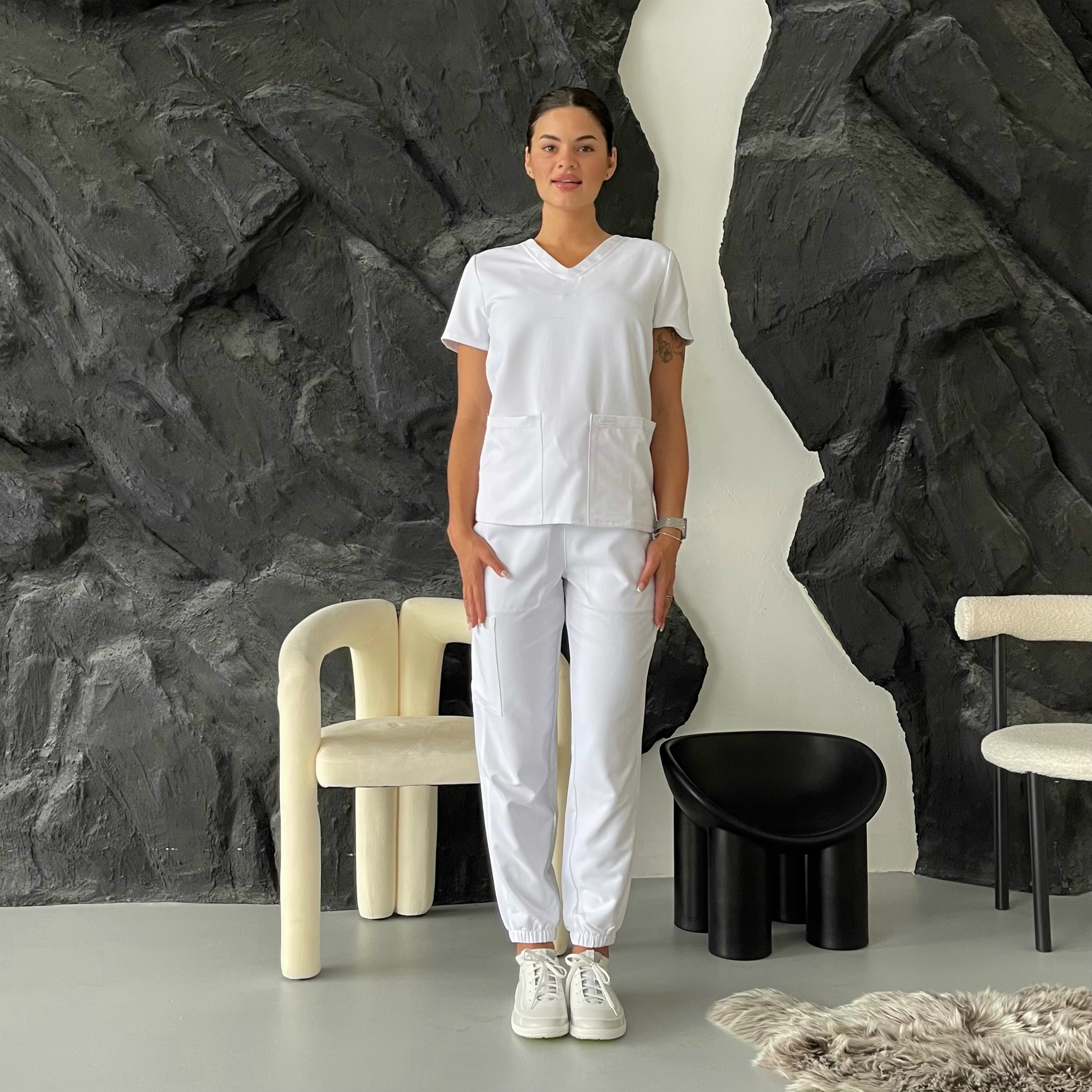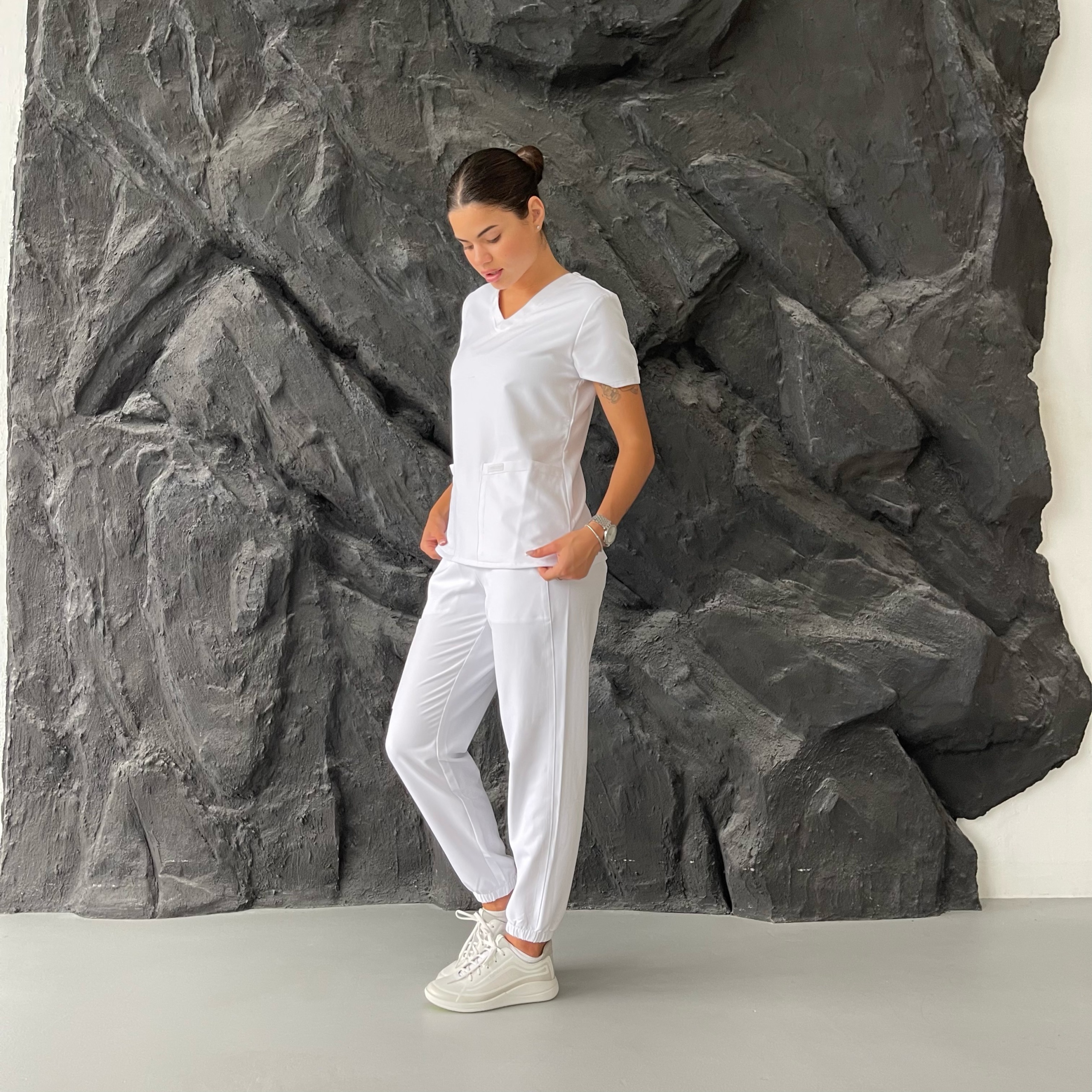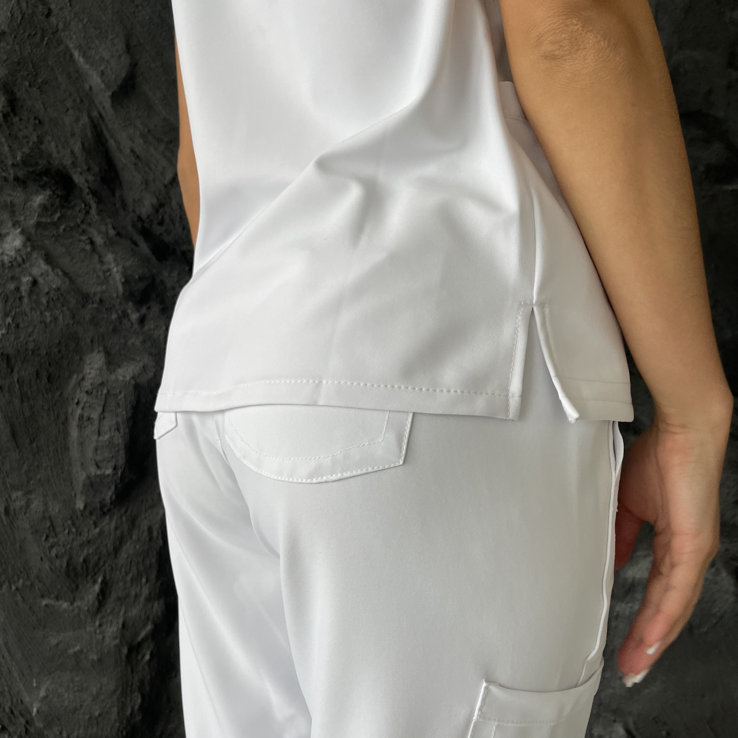Медичні штани в комплекті виконані з такого ж міцного матеріалу, що забезпечує комфорт та свободу рухів. Еластичний пояс дозволяє штанам ідеально сідати по фігурі, адаптуючись до будь-яких рухів. Штани оснащені кількома кишенями: бічними та задніми, що робить їх зручними для зберігання особистих речей та робочої атрибутики. Матеріал штанів також стійкий до зношування і зберігає первісний вигляд навіть після частих прань.