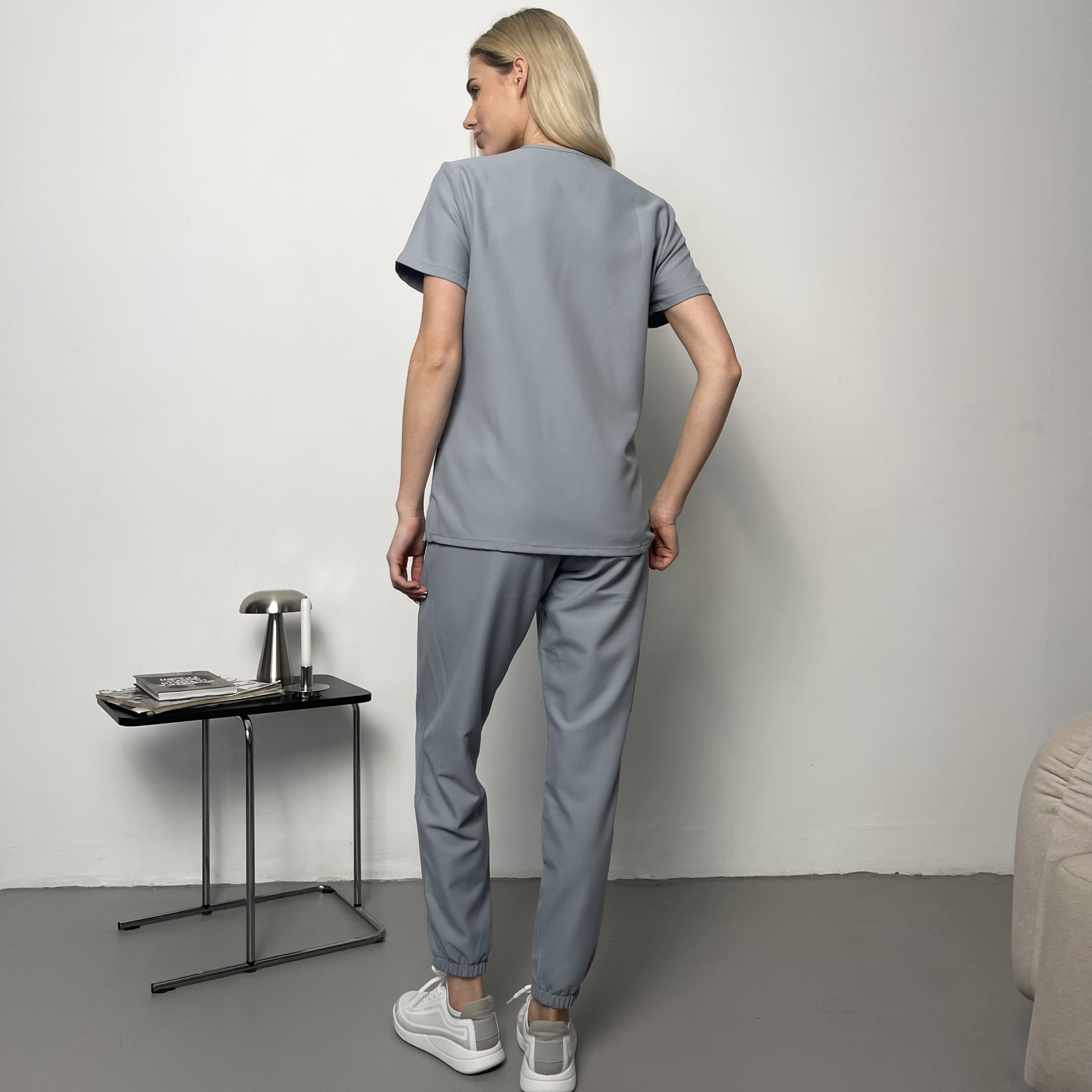 Медичні штани в комплекті виконані з такого ж міцного матеріалу, що забезпечує комфорт та свободу рухів. Еластичний пояс дозволяє штанам ідеально сідати по фігурі, адаптуючись до будь-яких рухів. Штани оснащені кількома кишенями: бічними та задніми, що робить їх зручними для зберігання особистих речей та робочої атрибутики. Матеріал штанів також стійкий до зношування і зберігає первісний вигляд навіть після частих прань.