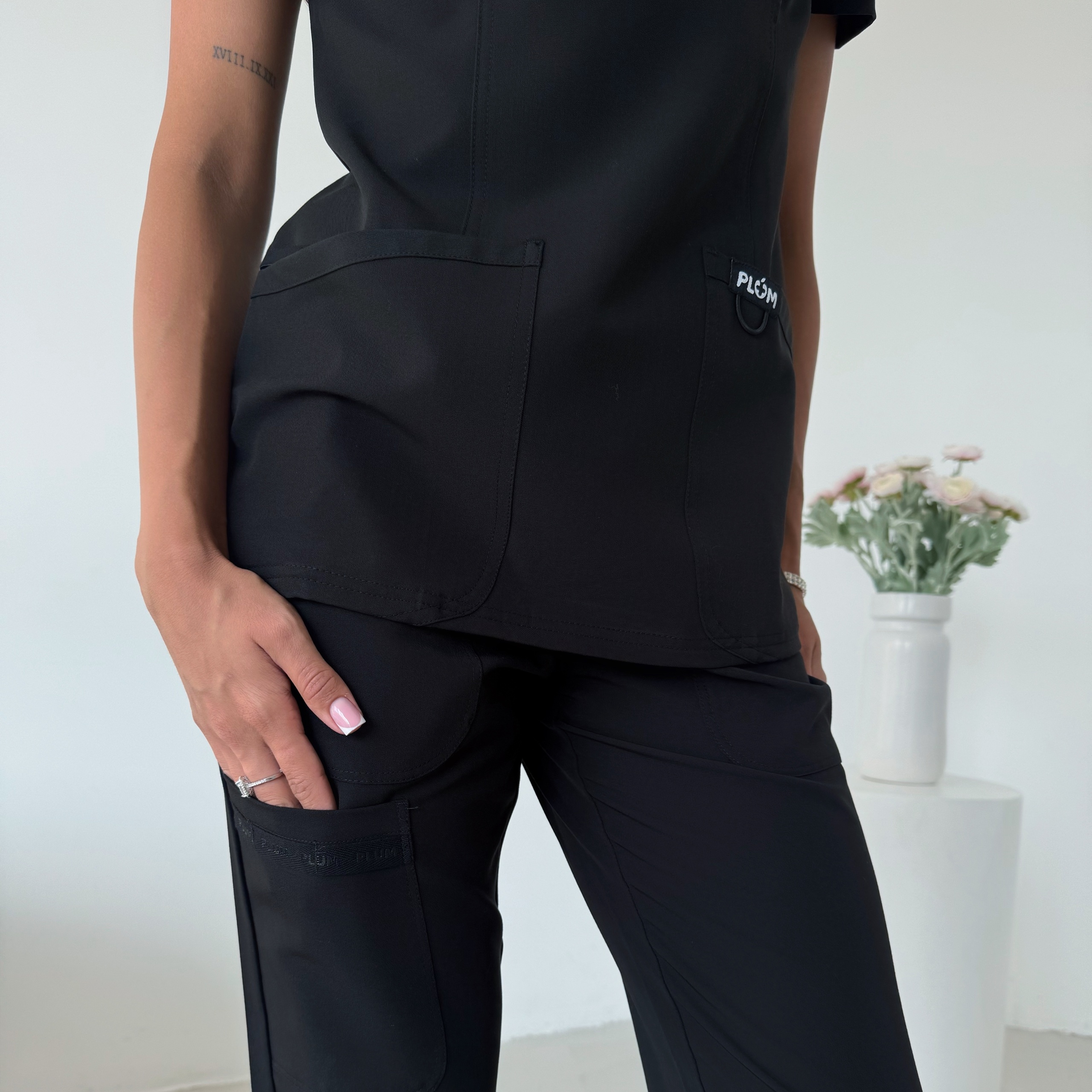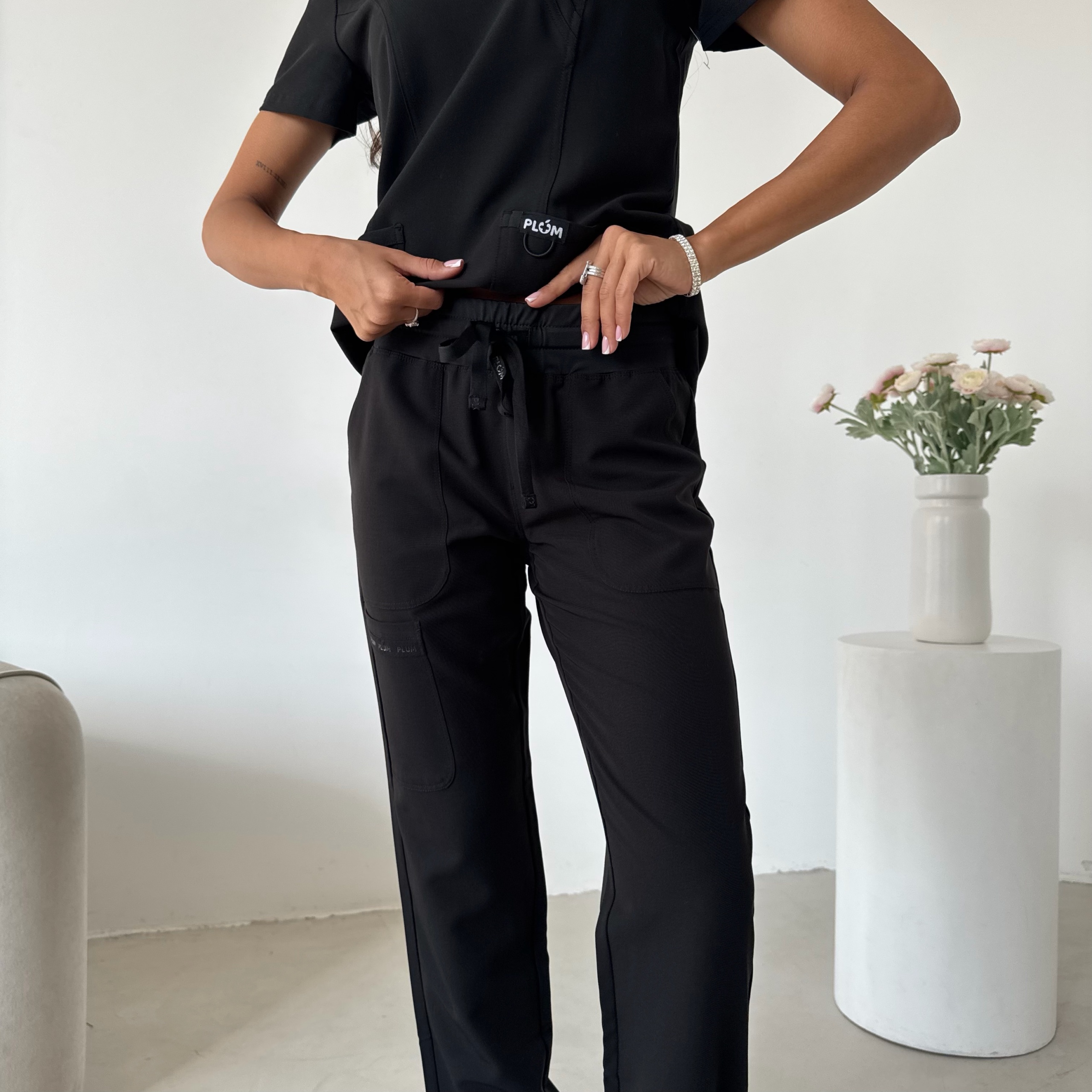 Комплект складається з витонченого топа на запах з приталеним силуетом і брюк-джогерів із м’яким еластичним поясом та фірмовим шнурком із логотипом Plum. Костюм виготовлено з легкої, приємної до тіла та антибактеріальної тканини, що запобігає розмноженню бактерій і зберігає відчуття свіжості протягом усього дня.