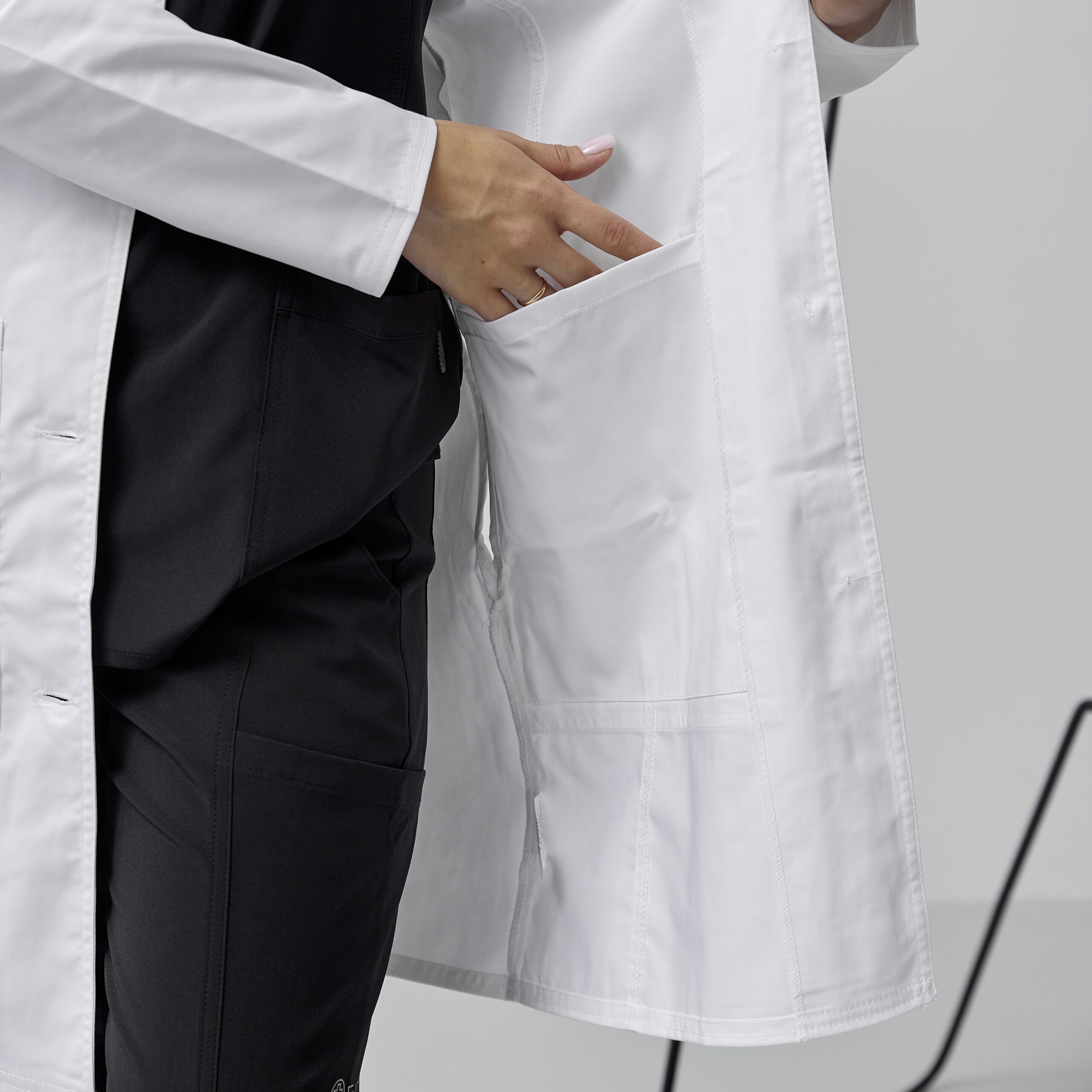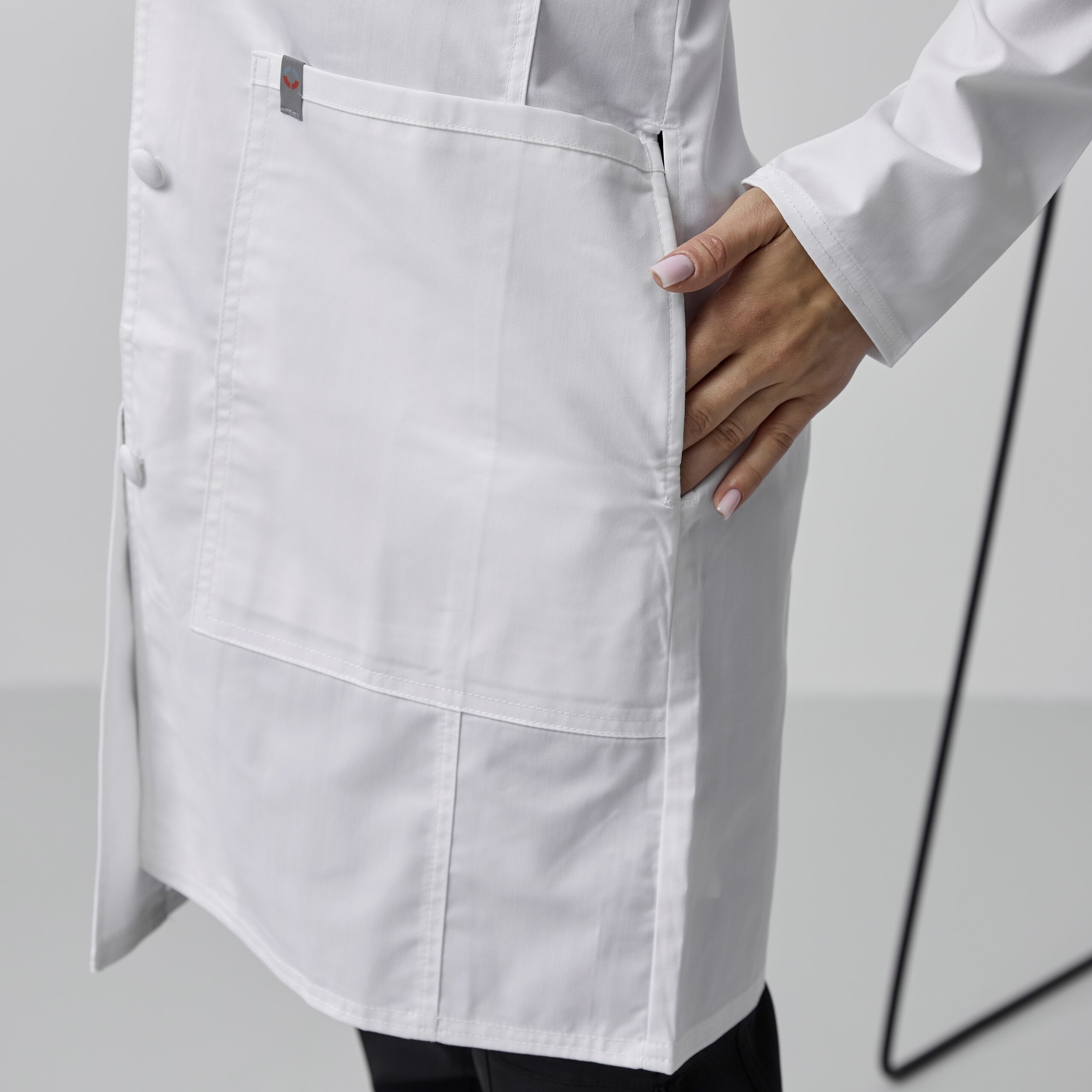 Прикрашають медичний халат чотири застібки на гудзики і класичний виріз на лацкані. Для зручності зберігання особистих речей, дизайнери розробили чотири кишені: одна нагрудна накладна, друга зовнішня секційна накладна кишеня, третя зовнішня кишеня для планшетів і непримітна внутрішня кишеня.